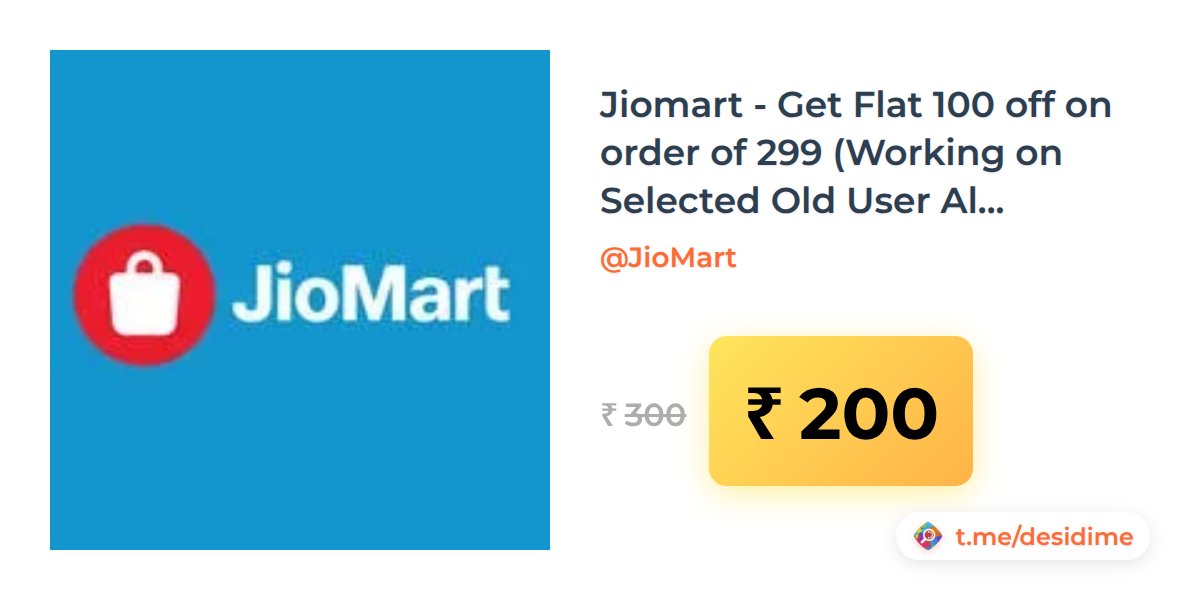 🌡383° - Jiomart - Get Flat 100 off on order of 299 (Working on Selected Old User Also)