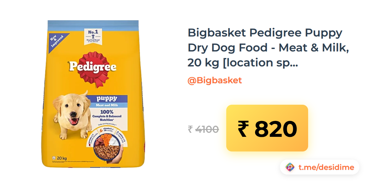80% off on - Bigbasket Pedigree Puppy Dry Dog Food - Meat & Milk, 20 kg [location specific] - Rs. 820