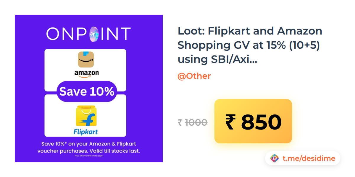 15% off on - Loot: Flipkart and Amazon Shopping GV at 15% (10+5) using SBI/Axis Cashback or High Rewarding CC. - Rs. 850