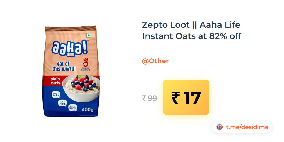 83% off on - Zepto Loot || Aaha Life Instant Oats at 82% off - Rs. 17