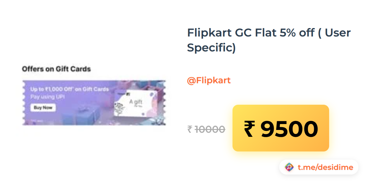 5% off on - Flipkart GC Flat 5% off ( User Specific) - Rs. 9500