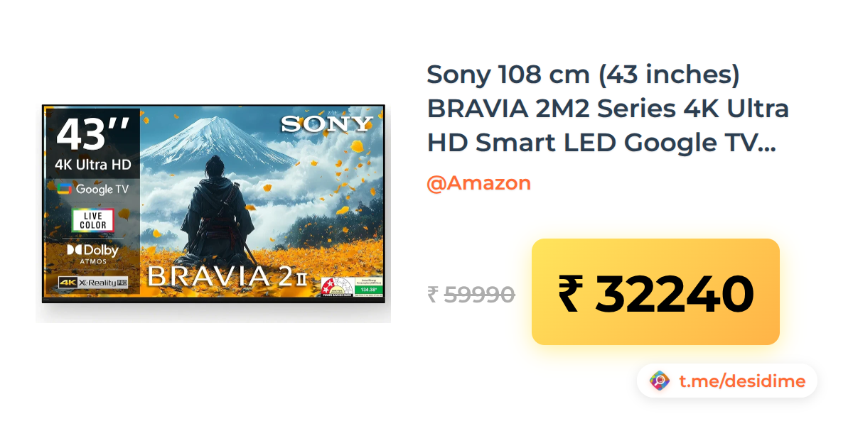 46% off on - Sony 108 cm (43 inches) BRAVIA 2M2 Series 4K Ultra HD Smart LED Google TV K-43S22BM2 - Rs. 32240
