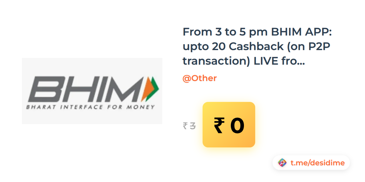 100% off on - From 3 to 5 pm BHIM APP: upto 20 Cashback (on P2P transaction) LIVE from 3-5PM - Rs. 0