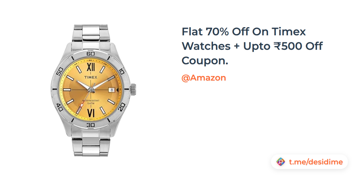 Flat 70% Off On Timex Watches + Upto ₹500 Off Coupon.