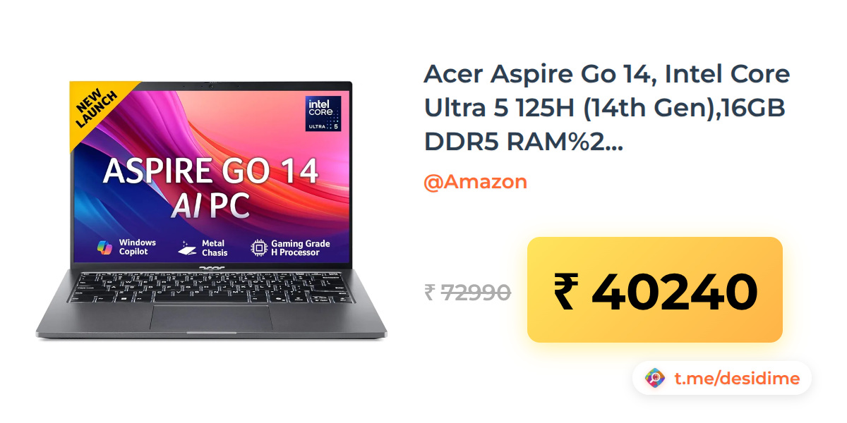 45% off on - Acer Aspire Go 14, Intel Core Ultra 5 125H (14th Gen),16GB DDR5 RAM/512GB SSD - Rs. 40240