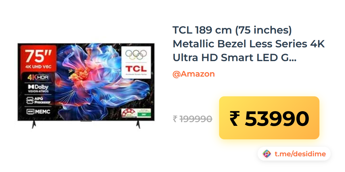 73% off on - TCL 189 cm (75 inches) Metallic Bezel Less Series 4K Ultra HD Smart LED Google TV 75V6C (Black) - Rs. 53990