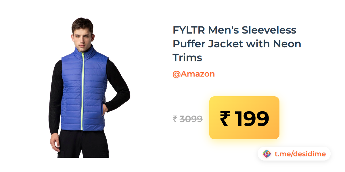 94% off on - FYLTR Men's Sleeveless Puffer Jacket with Neon Trims - Rs. 199