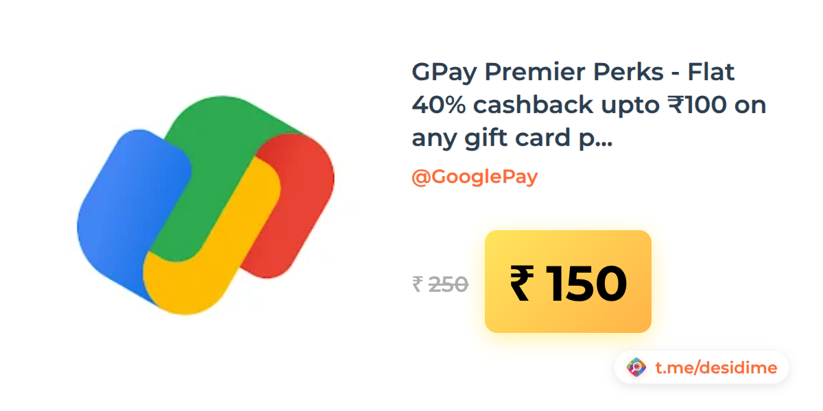 40% off on - GPay Premier Perks - Flat 40% cashback upto ₹100 on any gift card purchase Min order ₹250 - Rs. 150