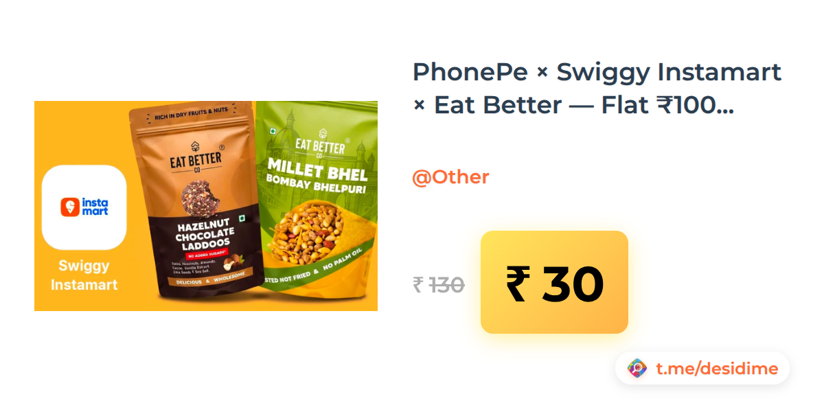 77% off on - PhonePe × Swiggy Instamart × Eat Better — Flat ₹100 OFF on ₹130 Order - Rs. 30