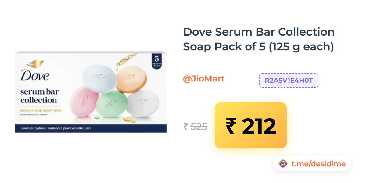 60% off on - Dove Serum Bar Collection Soap Pack of 5 (125 g each) - Rs. 212