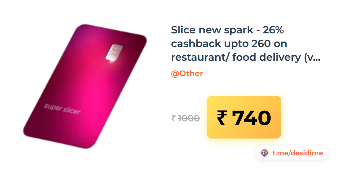 26% off on - Slice new spark - 26% cashback upto 260 on restaurant/ food delivery (valid for today) - Rs. 740