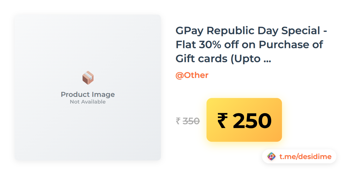 29% off on - GPay Republic Day Special - Flat 30% off on Purchase of Gift cards (Upto ₹100) - Rs. 250