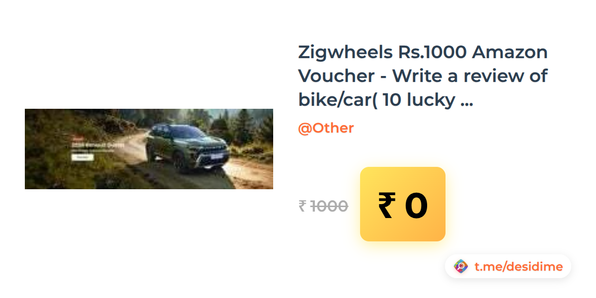 100% off on - Zigwheels Rs.1000 Amazon Voucher - Write a review of bike/car( 10 lucky winner every week) - Rs. 0
