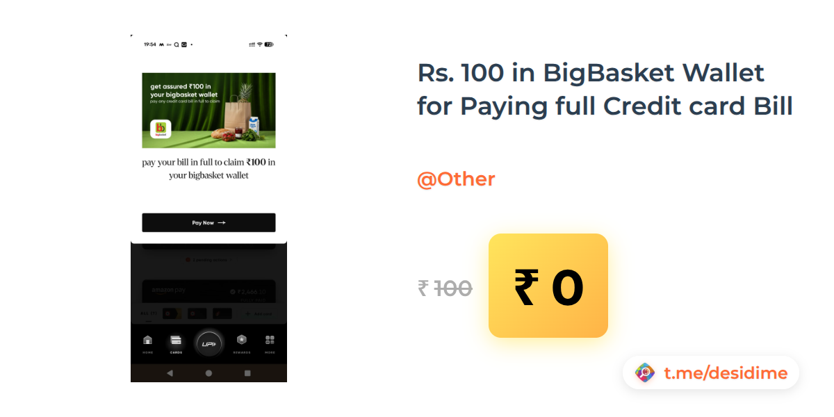 100% off on - Rs. 100 in BigBasket Wallet for Paying full Credit card Bill - Rs. 0