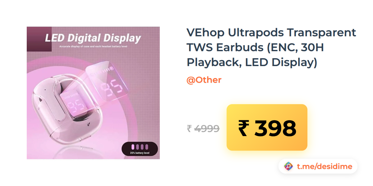 92% off on - VEhop Ultrapods Transparent TWS Earbuds (ENC, 30H Playback, LED Display) - Rs. 398