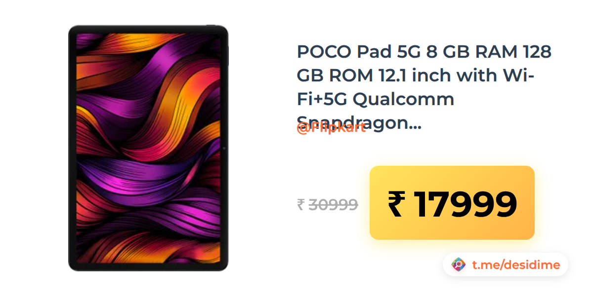 42% off on - POCO Pad 5G 8 GB RAM 128 GB ROM 12.1 inch with Wi-Fi+5G Qualcomm Snapdragon 7s Gen 2 Tablet - Rs. 17999