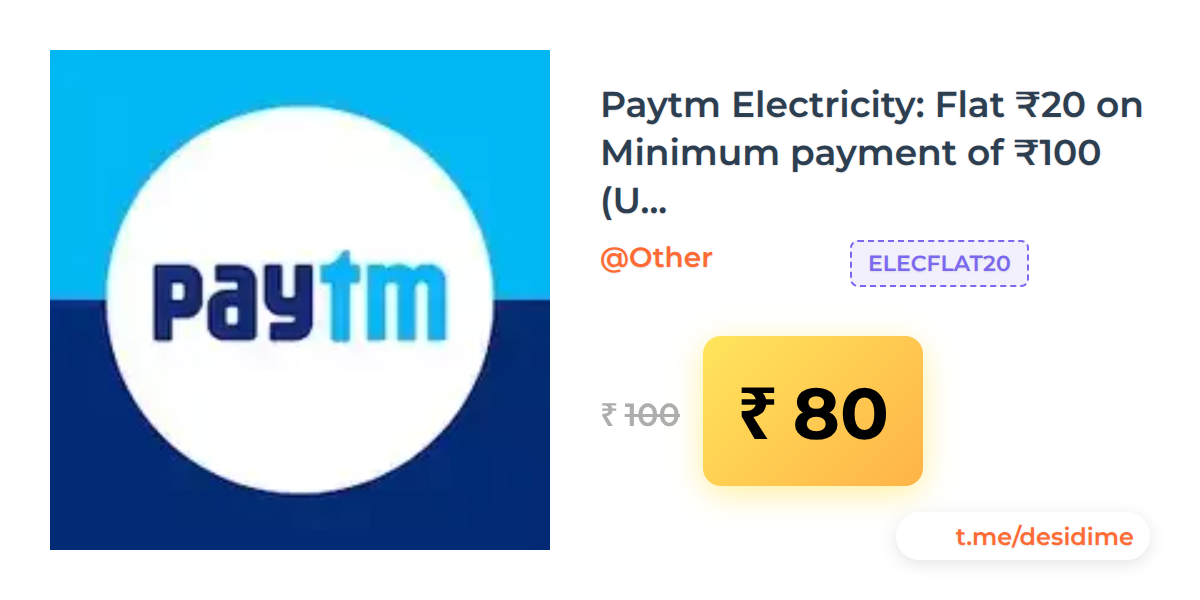 20% off on - Paytm Electricity: Flat ₹20 on Minimum payment of ₹100 (User Specific) - Rs. 80