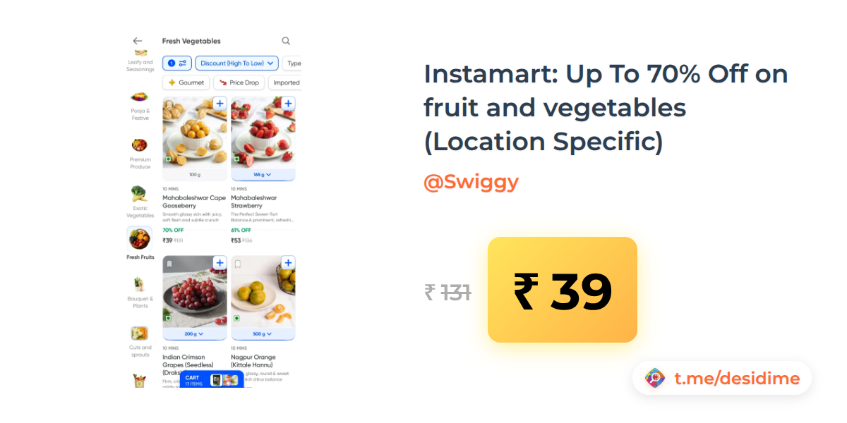 70% off on - Instamart: Up To 70% Off on fruit and vegetables (Location Specific) - Rs. 39