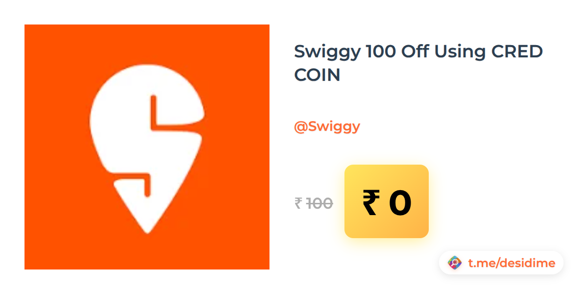 100% off on - Swiggy 100 Off Using CRED COIN - Rs. 0