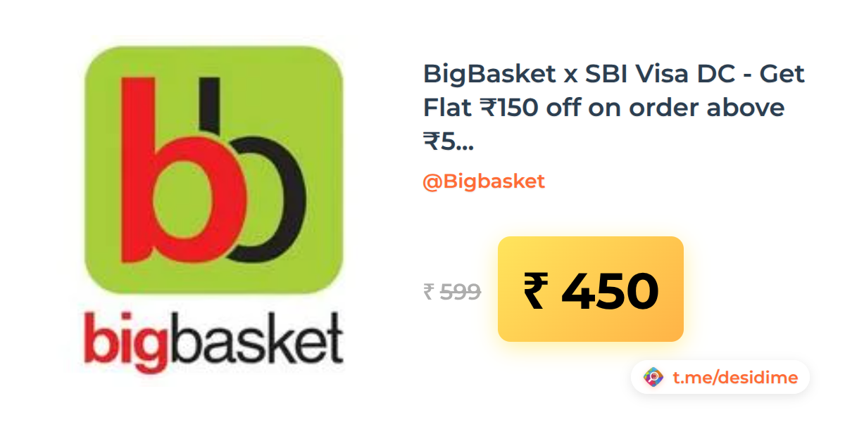 25% off on - BigBasket x SBI Visa DC - Get Flat ₹150 off on order above ₹599 (Working on Atta & Oil also) - Rs. 450