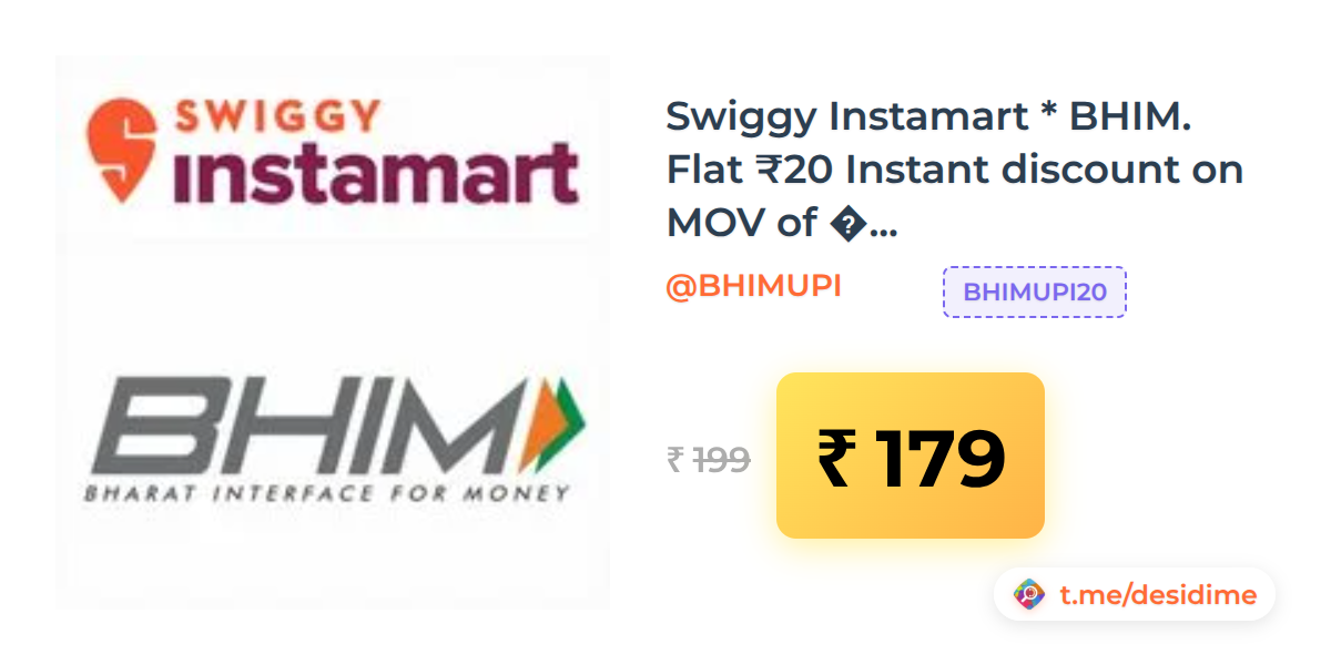 10% off on - Swiggy Instamart * BHIM. Flat ₹20 Instant discount on MOV of ₹199 on specific items (May be User Specific) - Rs. 179