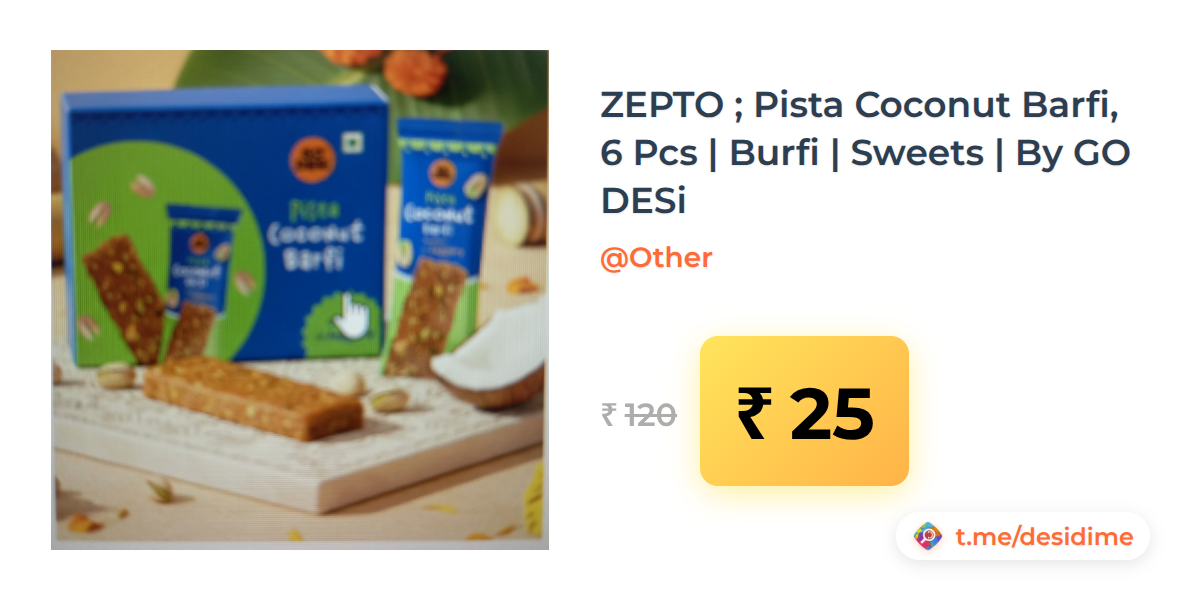 79% off on - ZEPTO ; Pista Coconut Barfi, 6 Pcs | Burfi | Sweets | By GO DESi - Rs. 25