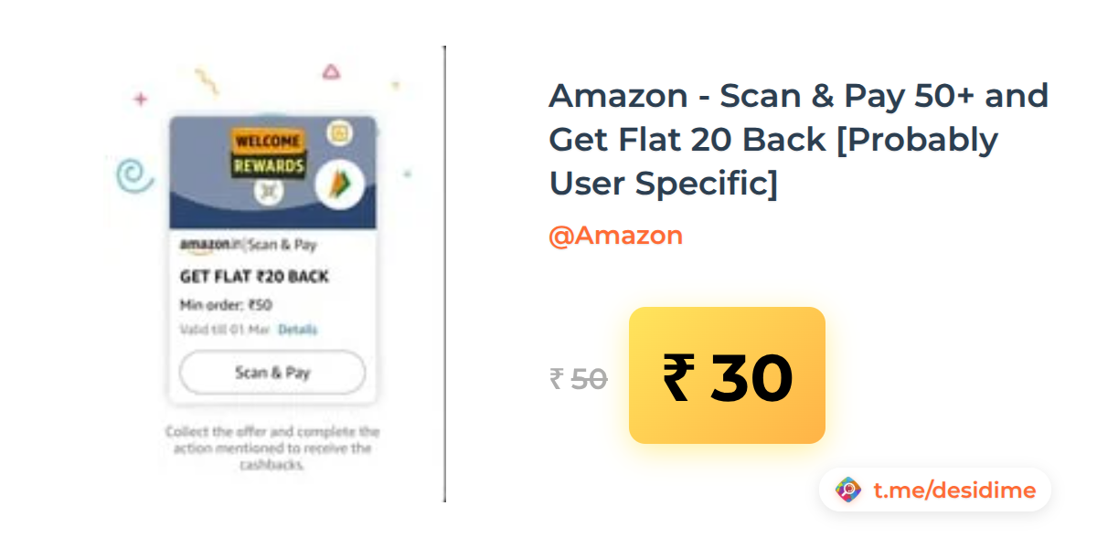 40% off on - Amazon - Scan & Pay 50+ and Get Flat 20 Back [Probably User Specific] - Rs. 30