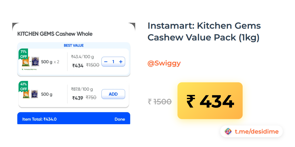 71% off on - Instamart: Kitchen Gems Cashew Value Pack (1kg) - Rs. 434