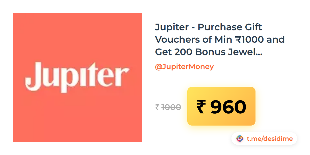 4% off on - Jupiter - Purchase Gift Vouchers of Min ₹1000 and Get 200 Bonus Jewels | Swiggy, Zomato, PVR, BookMyShow (User Specific) - Rs. 960