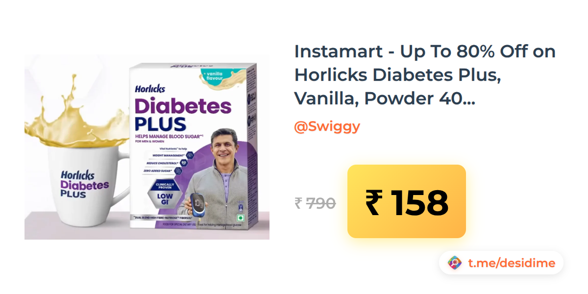 80% off on - Instamart - Up To 80% Off on Horlicks Diabetes Plus, Vanilla, Powder 400g [location specific] - Rs. 158