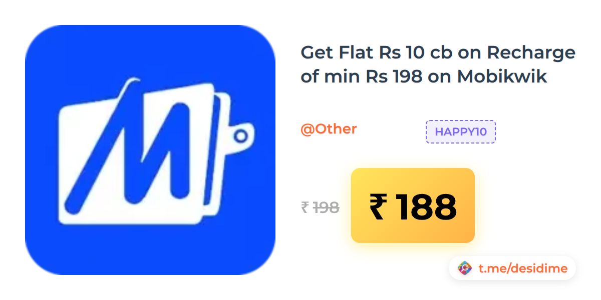 5% off on - Get Flat Rs 10 cb on Recharge of min Rs 198 on Mobikwik - Rs. 188