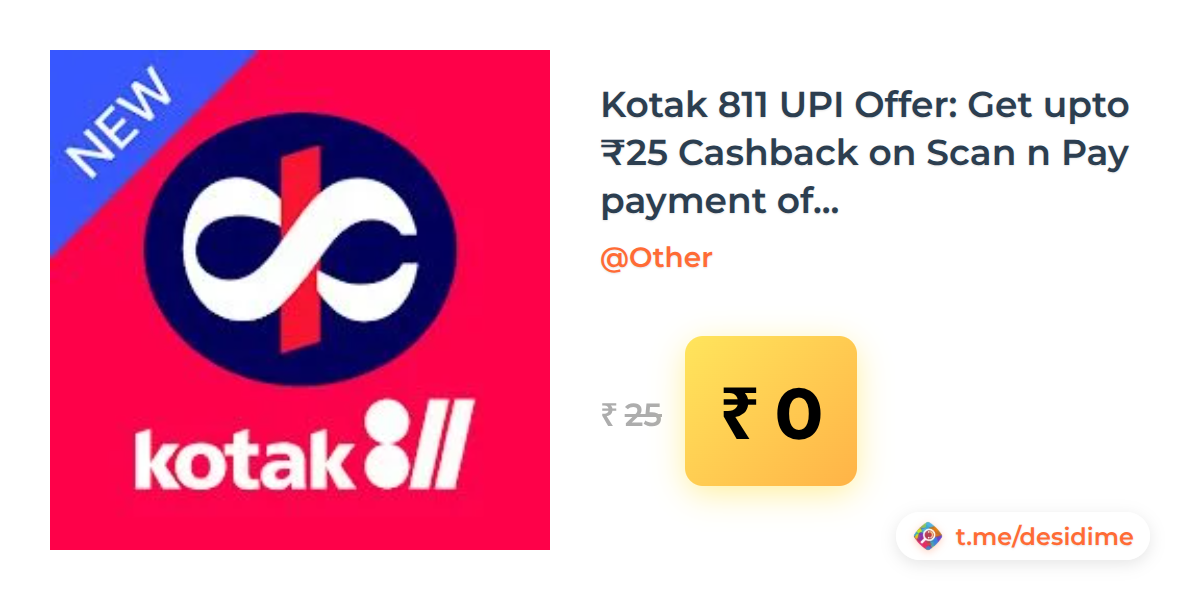 100% off on - Kotak 811 UPI Offer: Get upto ₹25 Cashback on Scan n Pay payment of min ₹811+ (Valid Feb 26-27) - Rs. 0