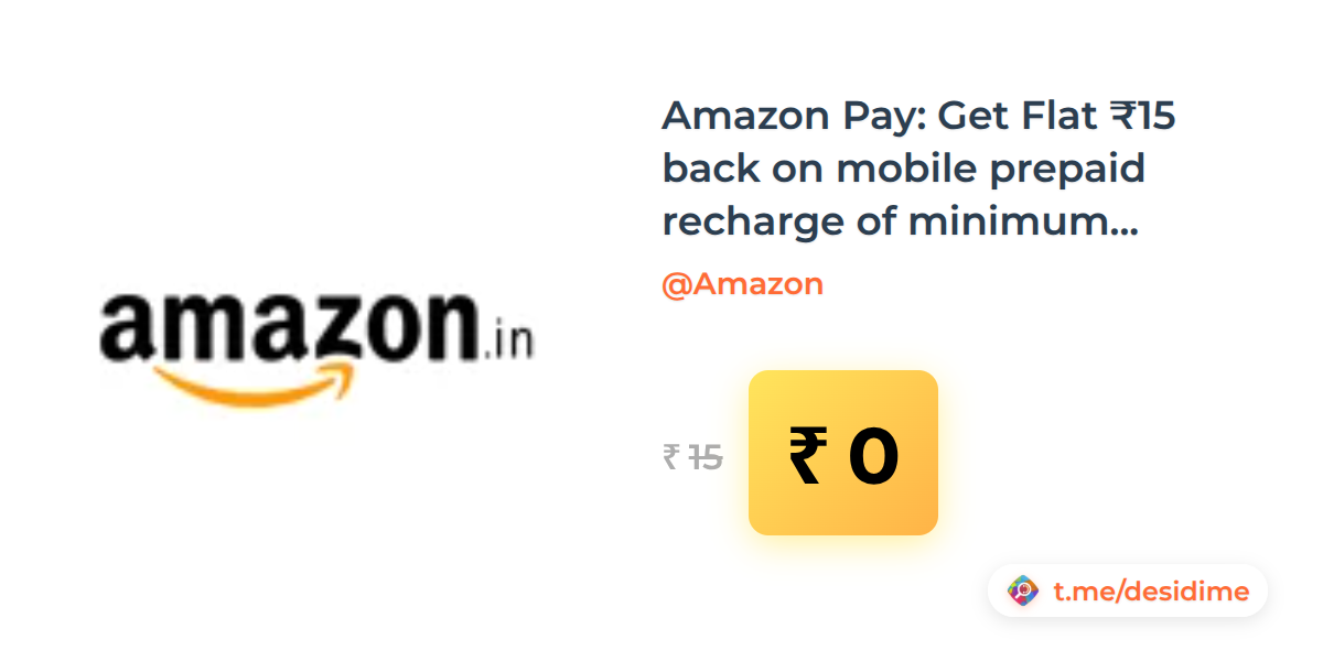 100% off on - Amazon Pay: Get Flat ₹15 back on mobile prepaid recharge of minimum ₹15 using Amazon Pay wallet - Rs. 0