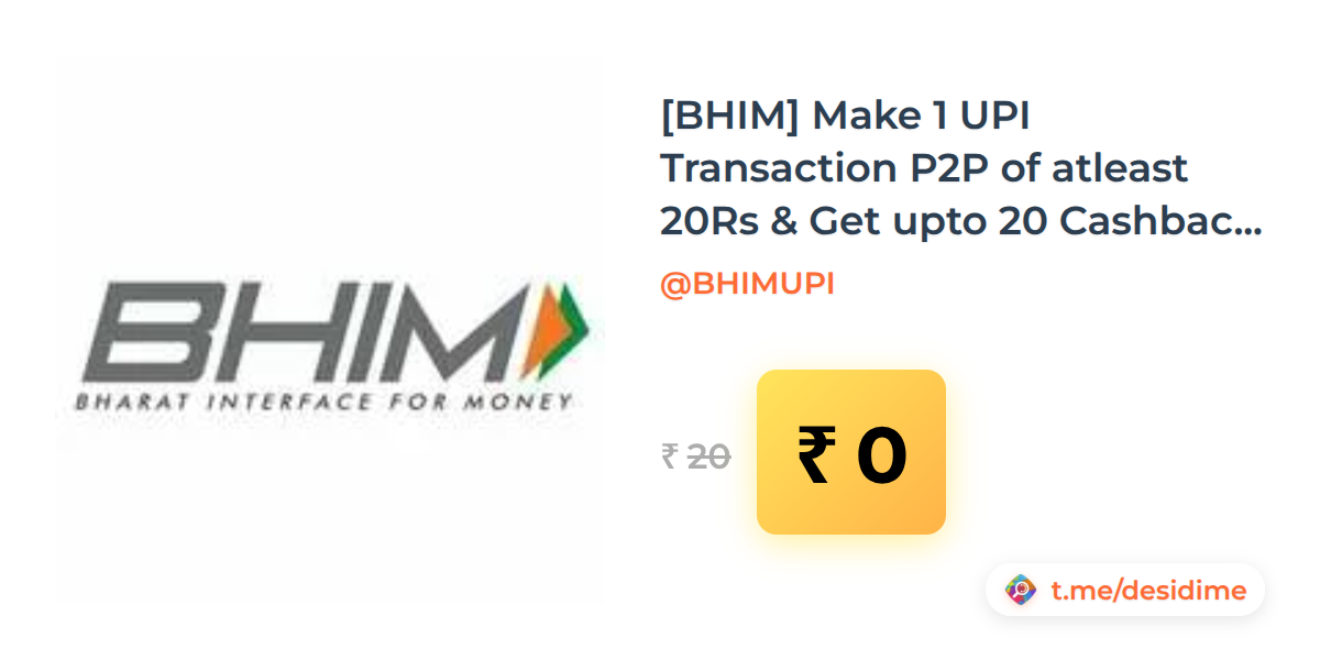 100% off on - [BHIM] Make 1 UPI Transaction P2P of atleast 20Rs & Get upto 20 Cashback 3PM - 4PM (6 March 2026) - Rs. 0