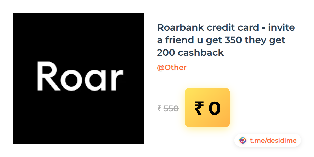 100% off on - Roarbank credit card - invite a friend u get 350 they get 200 cashback - Rs. 0