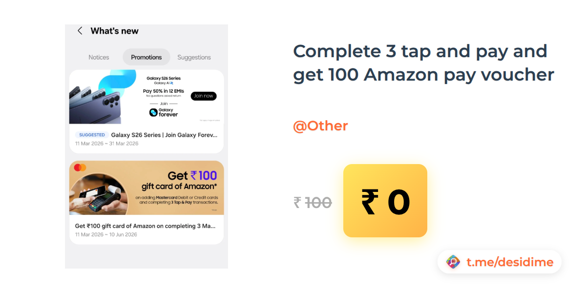 100% off on - Complete 3 tap and pay and get 100 Amazon pay voucher - Rs. 0