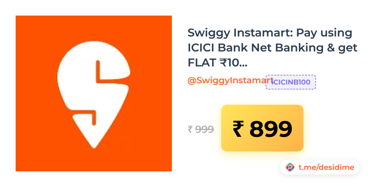 10% off on - Swiggy Instamart: Pay using ICICI Bank Net Banking & get FLAT ₹100 discount on orders above ₹999 - Rs. 899