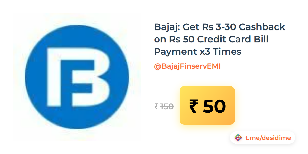 67% off on - Bajaj: Get Rs 3-30 Cashback on Rs 50 Credit Card Bill Payment x3 Times - Rs. 50