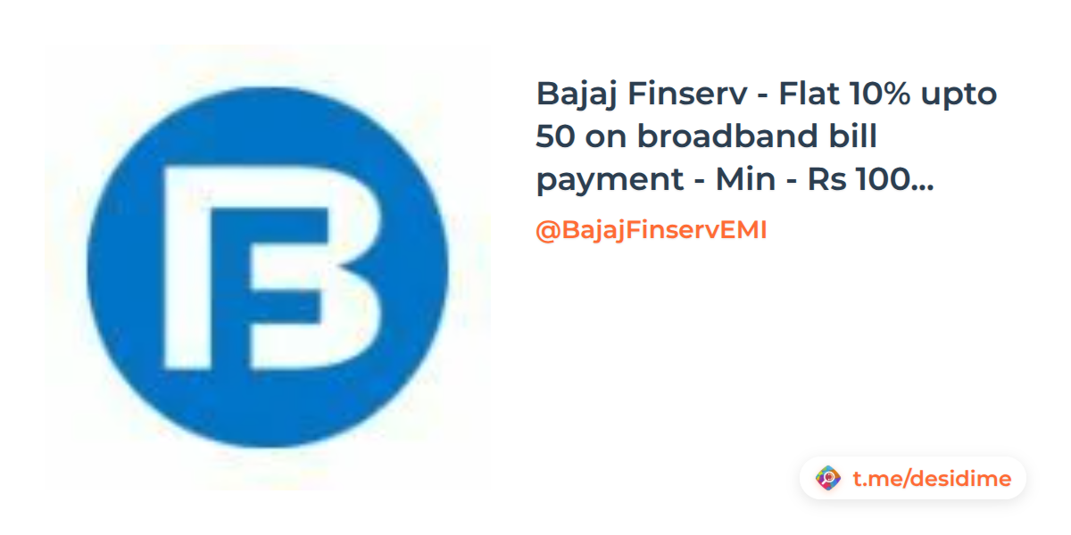 Bajaj Finserv - Flat 10% upto 50 on broadband bill payment - Min - Rs 100 ( 3PM - 5PM ) - Any Payment Mode