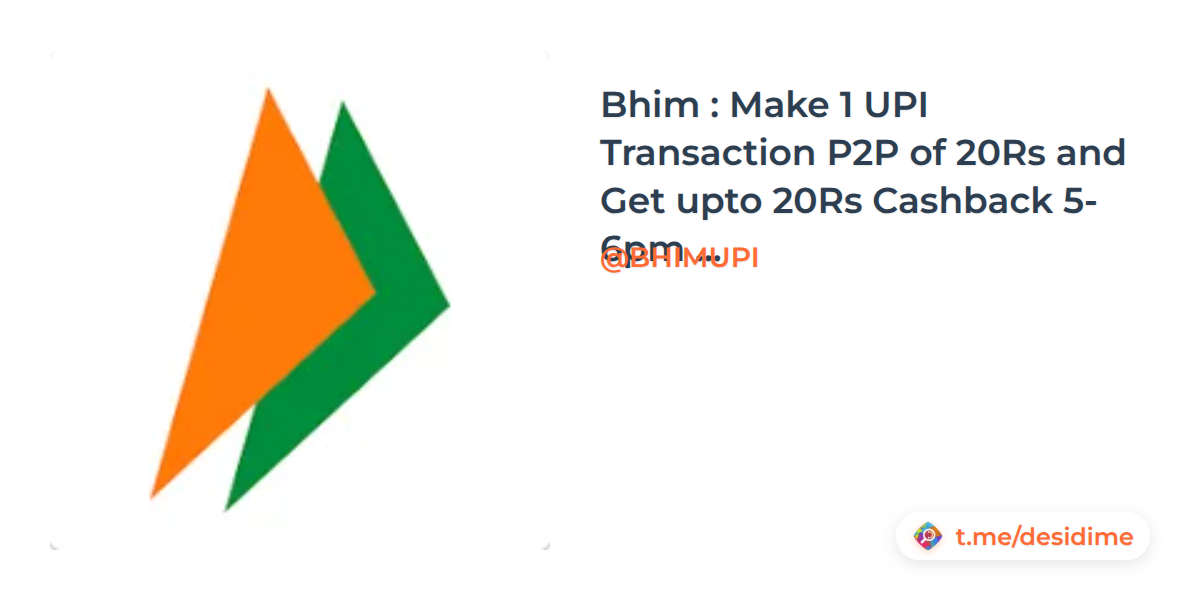 Bhim : Make 1 UPI Transaction P2P of 20Rs and Get upto 20Rs Cashback 5-6pm (12th March)