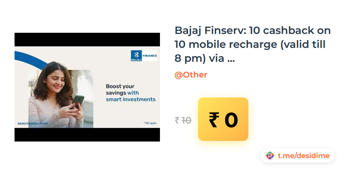 100% off on - Bajaj Finserv: 10 cashback on 10 mobile recharge (valid till 8 pm) via any payment mode - Rs. 0