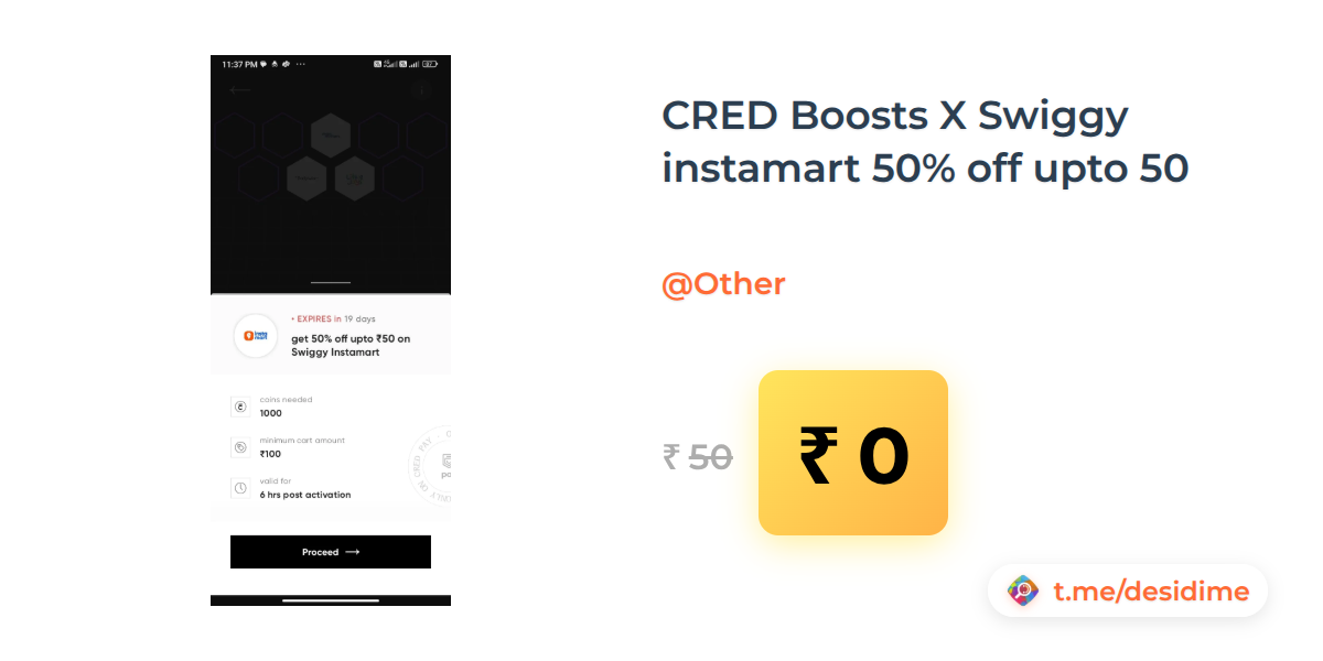 100% off on - CRED Boosts X Swiggy instamart 50% off upto 50 - Rs. 0