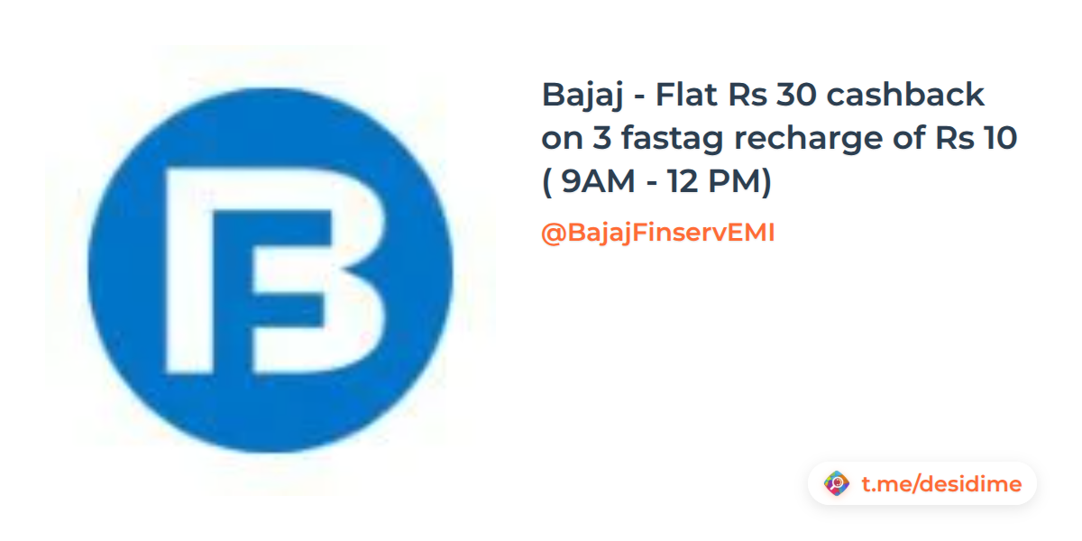 Bajaj - Flat Rs 30 cashback on 3 fastag recharge of Rs 10 ( 9AM - 12 PM)