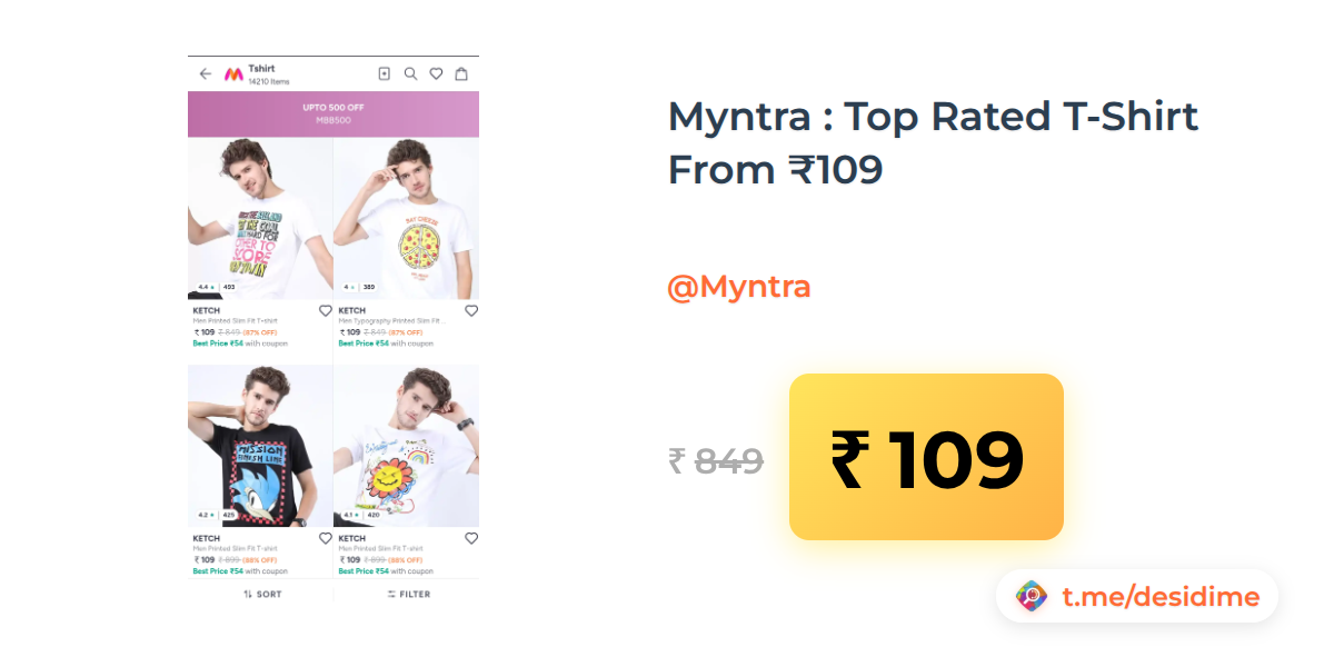 87% off on - Myntra : Top Rated T-Shirt From ₹109 - Rs. 109