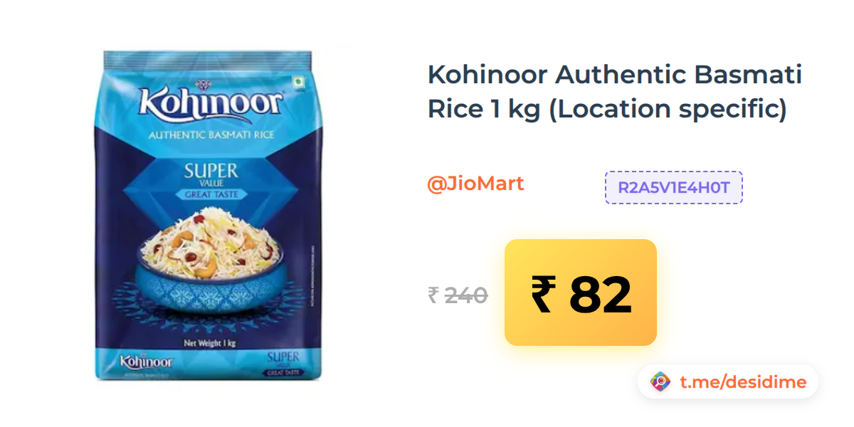 66% off on - Kohinoor Authentic Basmati Rice 1 kg (Location specific) - Rs. 82