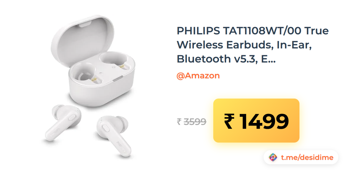 58% off on - PHILIPS TAT1108WT/00 True Wireless Earbuds, In-Ear, Bluetooth v5.3, Earphones - Rs. 1499
