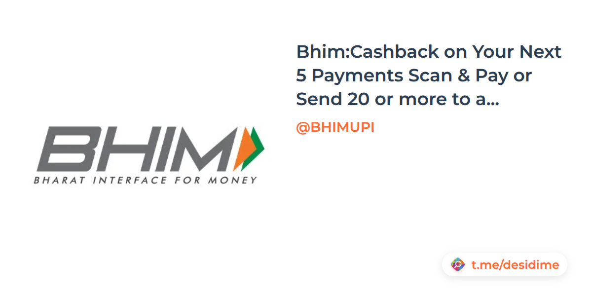 Bhim:Cashback on Your Next 5 Payments Scan & Pay or Send 20 or more to anyone on BHIM and enjoy up to ₹20 instant cashback every time, for your next 5 payments. (Maybe User Specific)