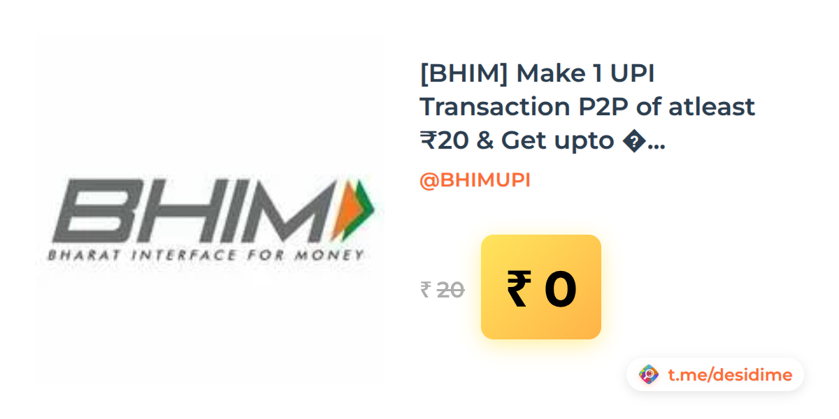 100% off on - [BHIM] Make 1 UPI Transaction P2P of atleast ₹20 & Get upto ₹50 Cashback 5PM - 6PM (18 March 2026) - Rs. 0