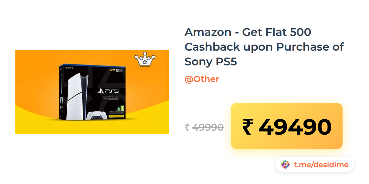 1% off on - Amazon - Get Flat 500 Cashback upon Purchase of Sony PS5 - Rs. 49490