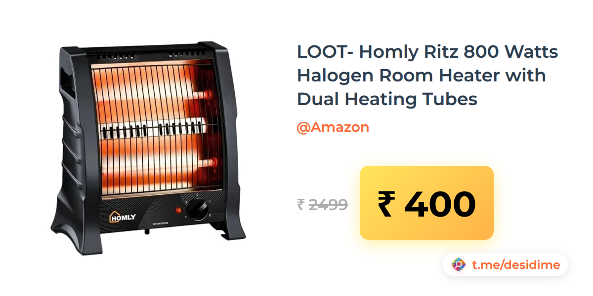 84% off on - LOOT- Homly Ritz 800 Watts Halogen Room Heater with Dual Heating Tubes - Rs. 400